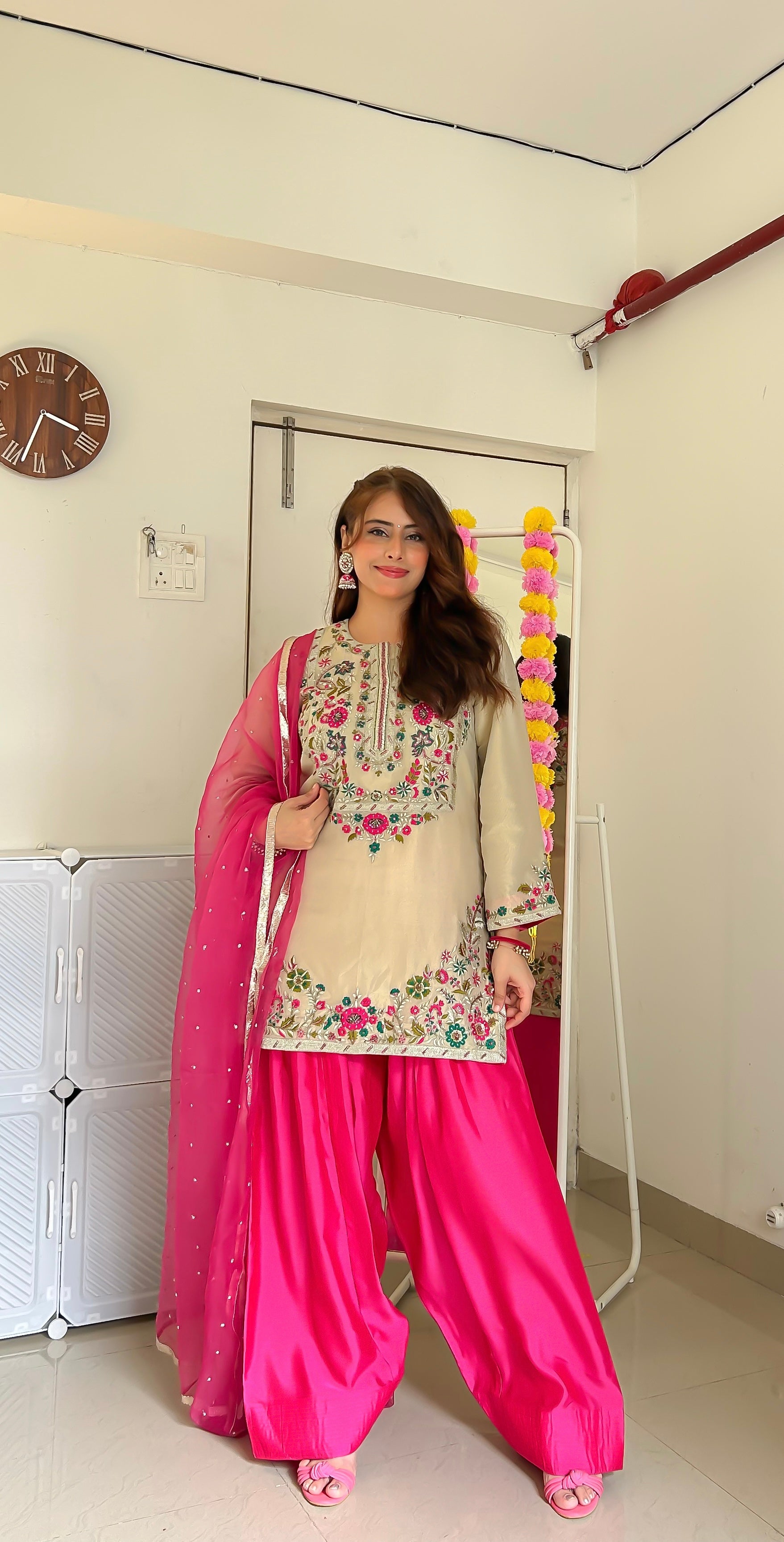 This enchanting hand-embroidered Pakistani suit is crafted with premium glass silk fabric. Its impressive low-shoulder design makes it a standout option for any special event. The beautiful, subtle color of the kurta, paired with the pink Lahori salwar and dupatta, creates a sophisticated combination. Each piece is adorned with intricate embroidery that adds a touch of glamour and ensures you capture attention wherever you go. Perfect for celebrating those unforgettable moments, Ada-E-Noor combines classic charm with modern grace exquisitely.