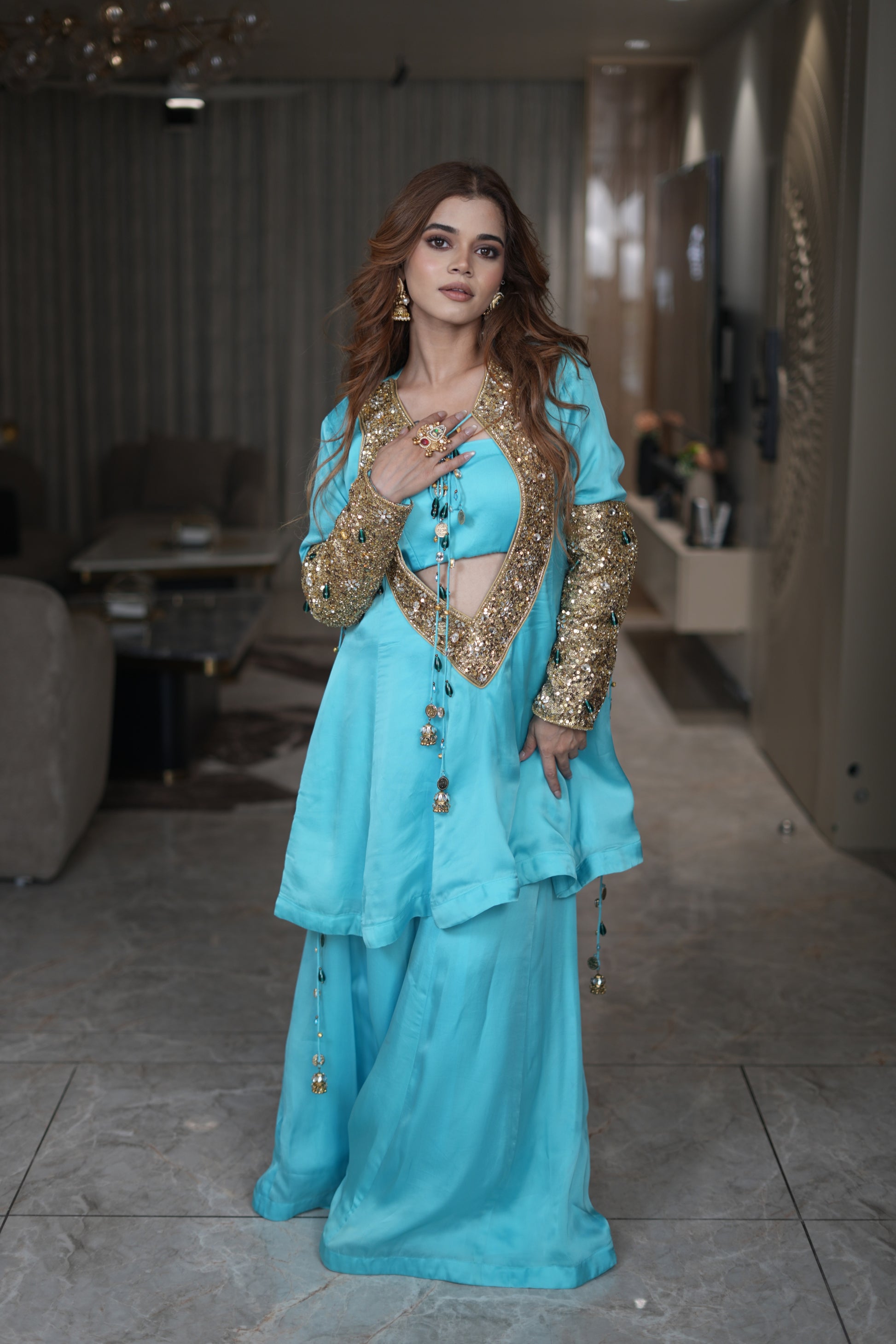 Unveil the elegance of celestial charm with our Aqua Noor Hand-Embellished Sharara Set by Poonam Rajput Luxury Label. Crafted in a serene aqua blue silk fabric, this ensemble beautifully captures the essence of royal grandeur blended with modern femininity.