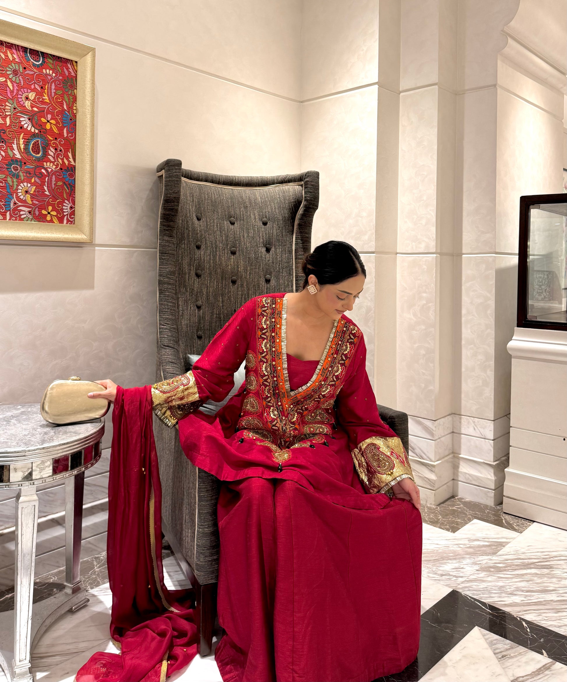 Perfect for wedding festivities, sangeet nights, or festive soirées, this outfit embodies the grandeur of Indian artistry with a contemporary touch. Pair it with statement earrings and a minimal clutch to complete your royal look.