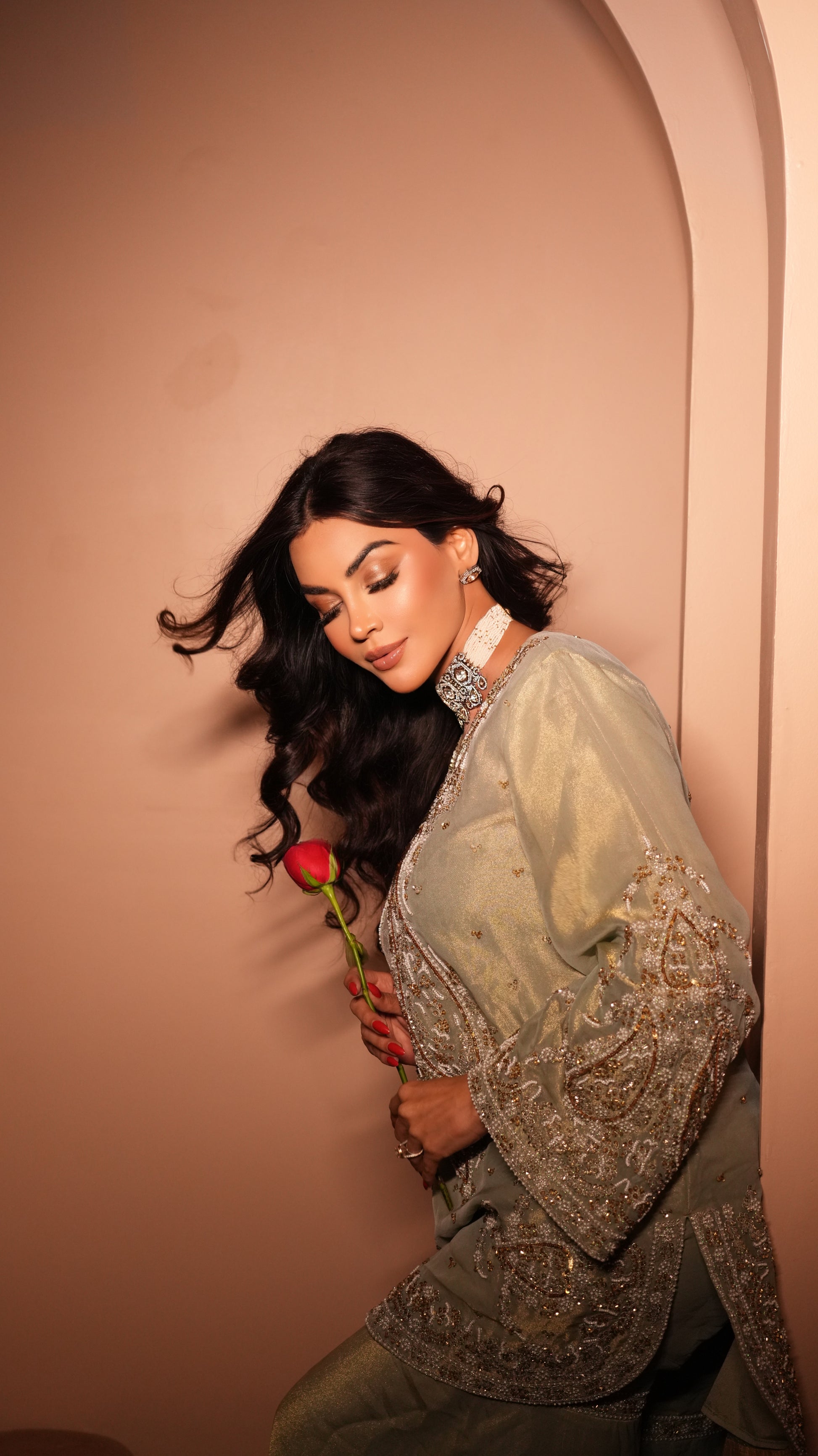 The flared sharara pants flow effortlessly, adding movement and charm to your look, while the pastel mint hue brings a refreshing and sophisticated vibe—perfect for both daytime and evening festivities.